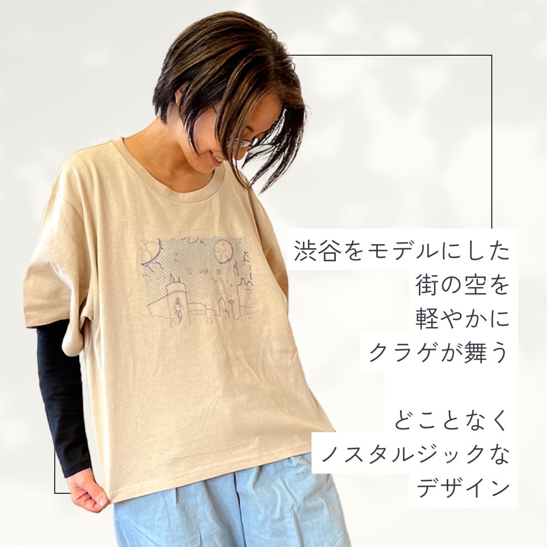 渋谷をモデルにした街の空に舞う美しいミズクラゲのイラストがプリントされた一枚。